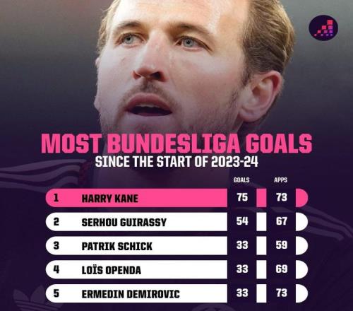 本赛季德甲第10轮,拜仁客场2-2战平柏林联合,凯恩在补时阶段头球绝平。这场比赛后,凯恩在73场德甲比赛中已打入75球。自2023/24赛季德甲首秀后,凯恩位列同期球员进球数第一。